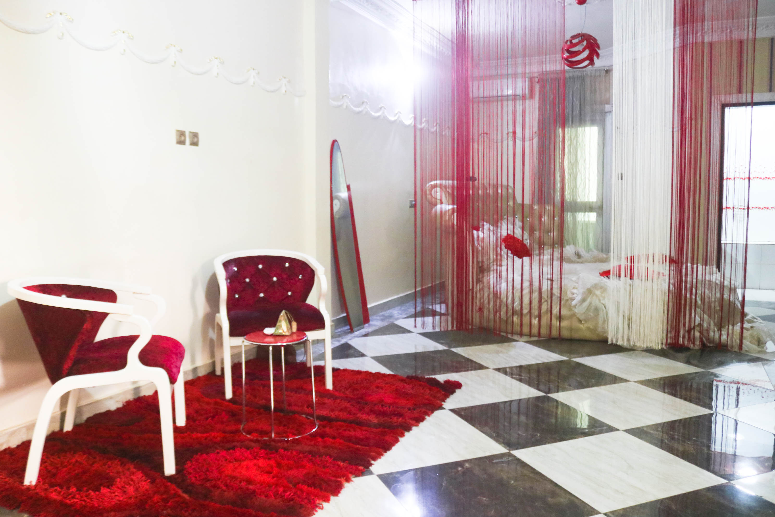 Mini salon romantique, chambre, salle de bain avec baignoire.
